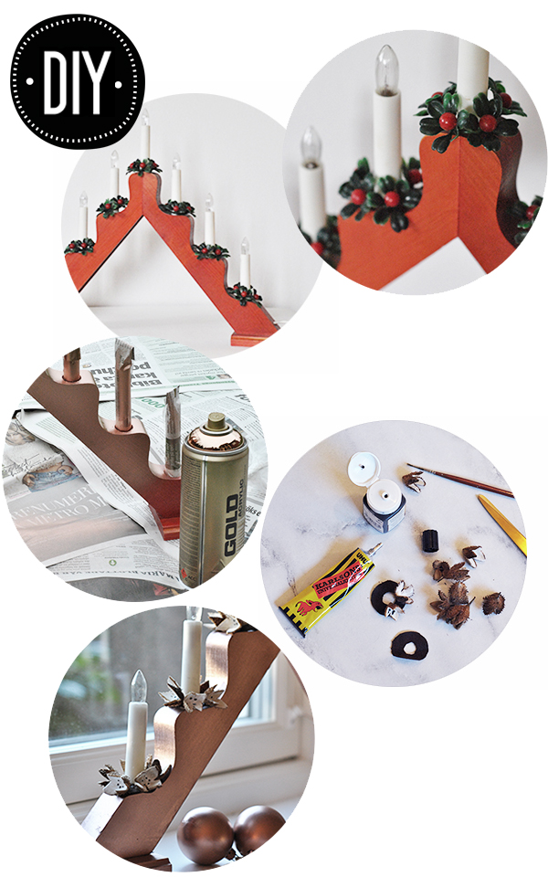Min har jag sprayat till en kopparfärg som känns mer Anno 2013. Min mamma och jag har sedan pysslat ihop manchetter i samma anda som hon gjorde på glada 70-talet. Med en tygbit, sax, lim, färg och bokollonskal har vi målat och limmat ihop 7 nya manschetter.